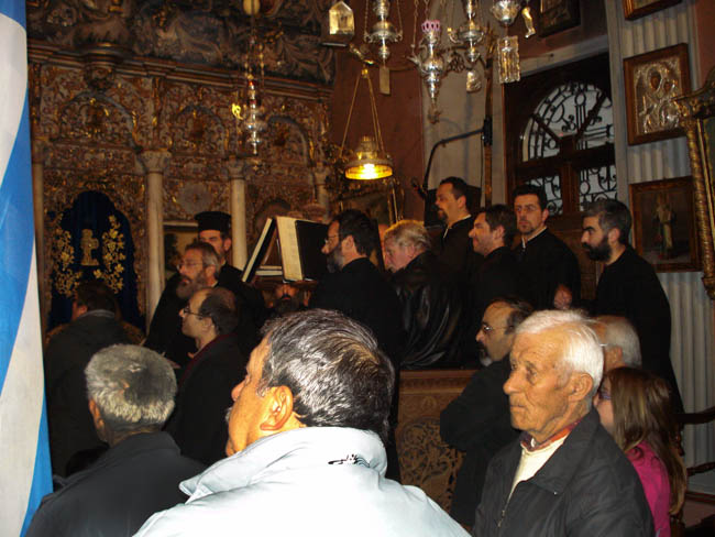 Κατά την Ακολουθία του Εσπερινού όπου συμμετείχε όλος ο Ιερός Κλήρος της ιεράς νήσου έψαλλαν μαθητές και απόφοιτοι της Σχολής Βυζαντινής Εκκλησιαστικής Μουσικής υπό την διεύθυνση του Πρωτοψάλτου του Ναού κ. Στυλ. Κοντακιώτη.