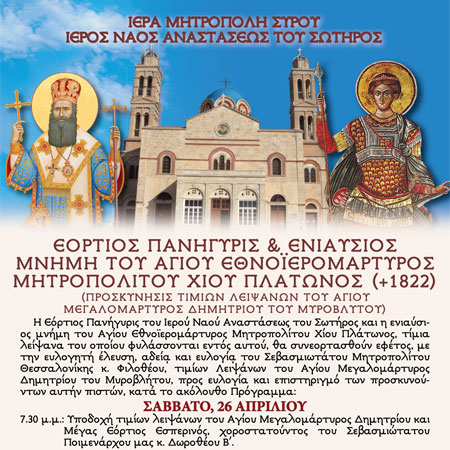 Εόρτιος Πανήγυρις & Ενιαύσιος Μνήμη του Αγίου Εθνοϊερομάρτυρος Μητροπολίτου Χίου Πλάτωνος (+1822) (Προσκύνησις Τιμίων Λειψάνων του Αγίου Μεγαλομάρτυρος Δημητρίου του Μυροβλύτου)