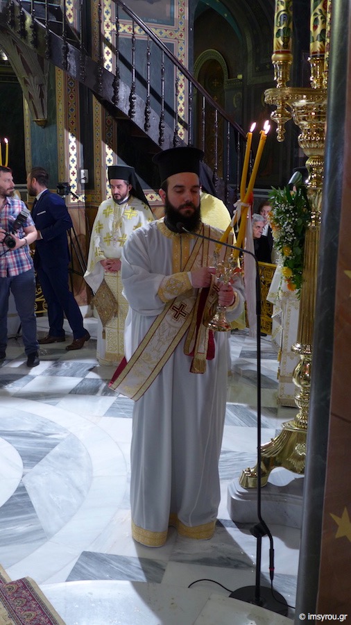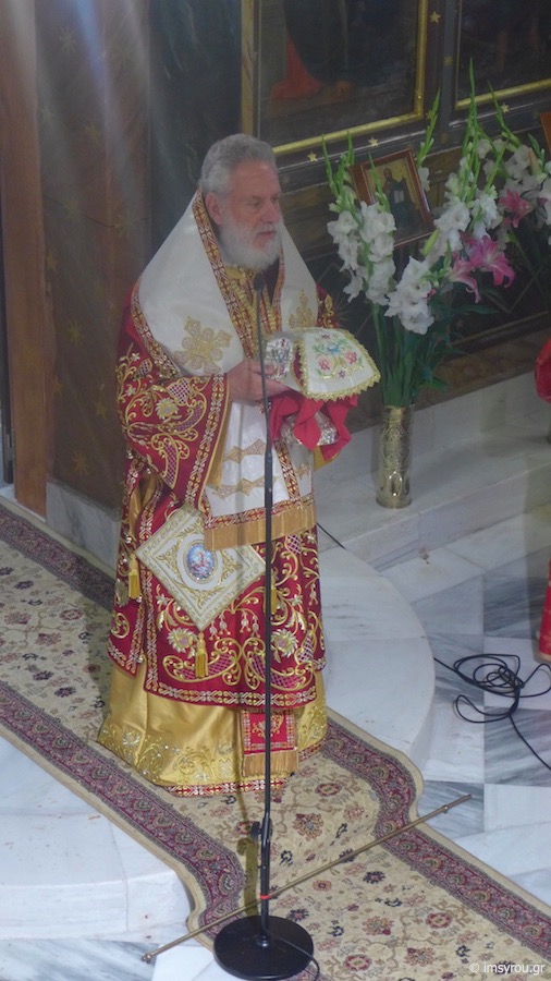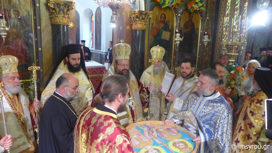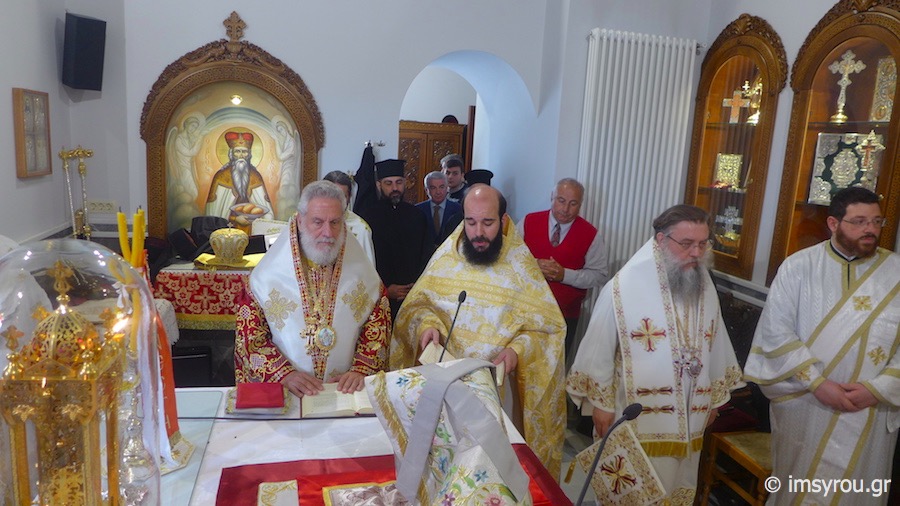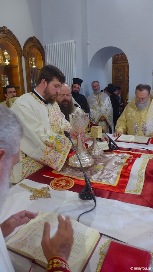 Προ του πέρατος της Θείας Λειτουργίας, χειροθέτησε Αρχιμανδρίτη τον νεοχειροτονηθέντα Πρεσβύτερο.