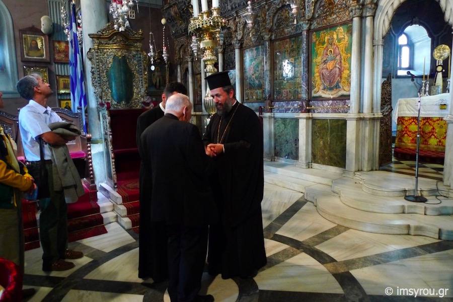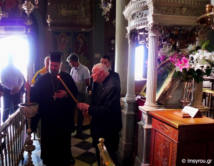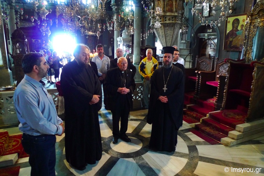 Ο Αρχιερατικός Επίτροπος της ιεράς νήσου Τήνου, Πρωτοπρ. Γεώργιος Φανερός καλωσόρισε τον Καρδινάλιο και την τιμία συνοδεία του εκ μέρους του Σεβ. κ. Δωροθέου, τον ξενάγησε στον Ναό της Μεγαλόχαρης και στον Ναό της Ευρέσεως της αγίας Εικόνος και ευχήθηκε καλή δύναμη στο έργο του.