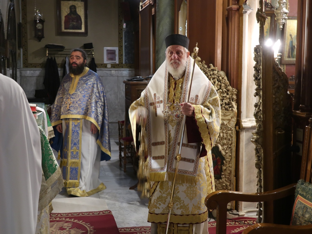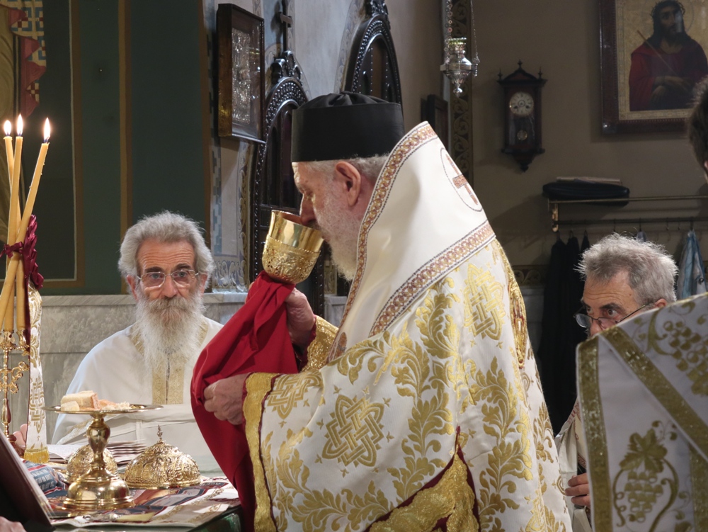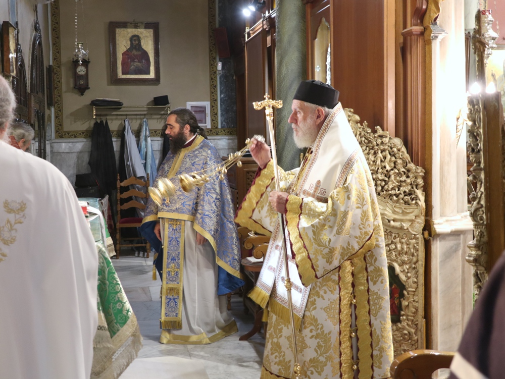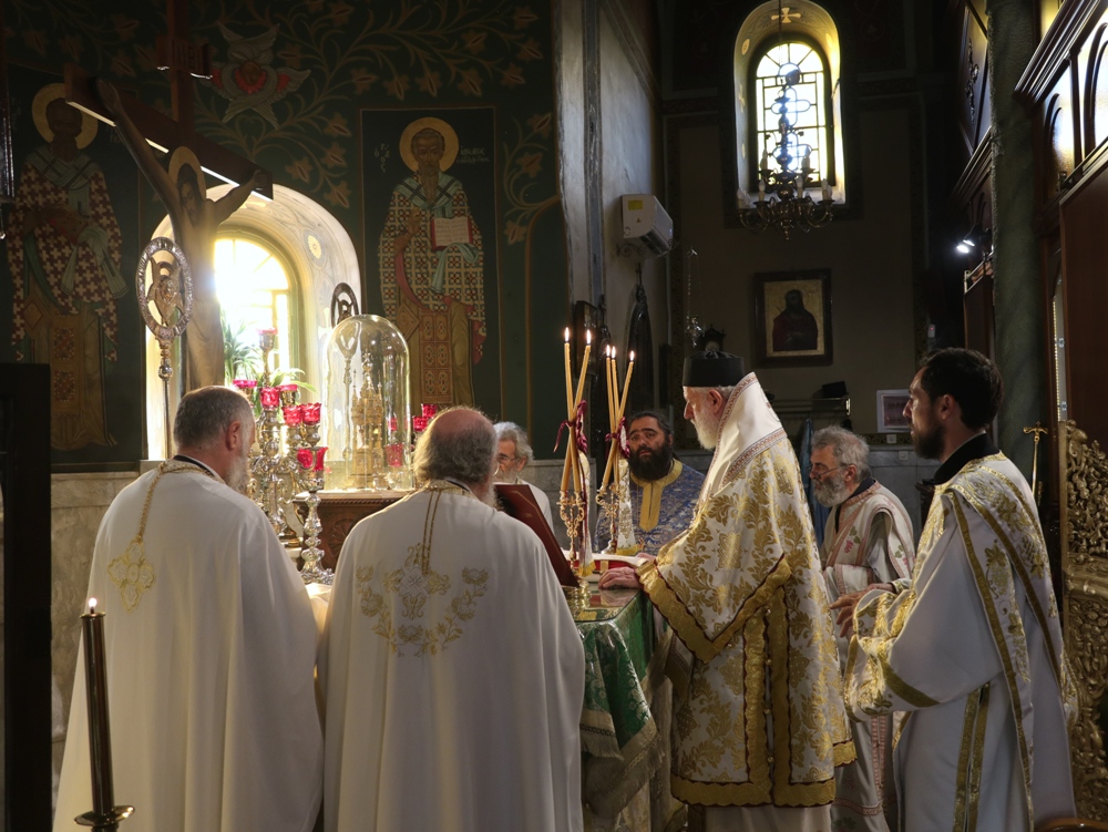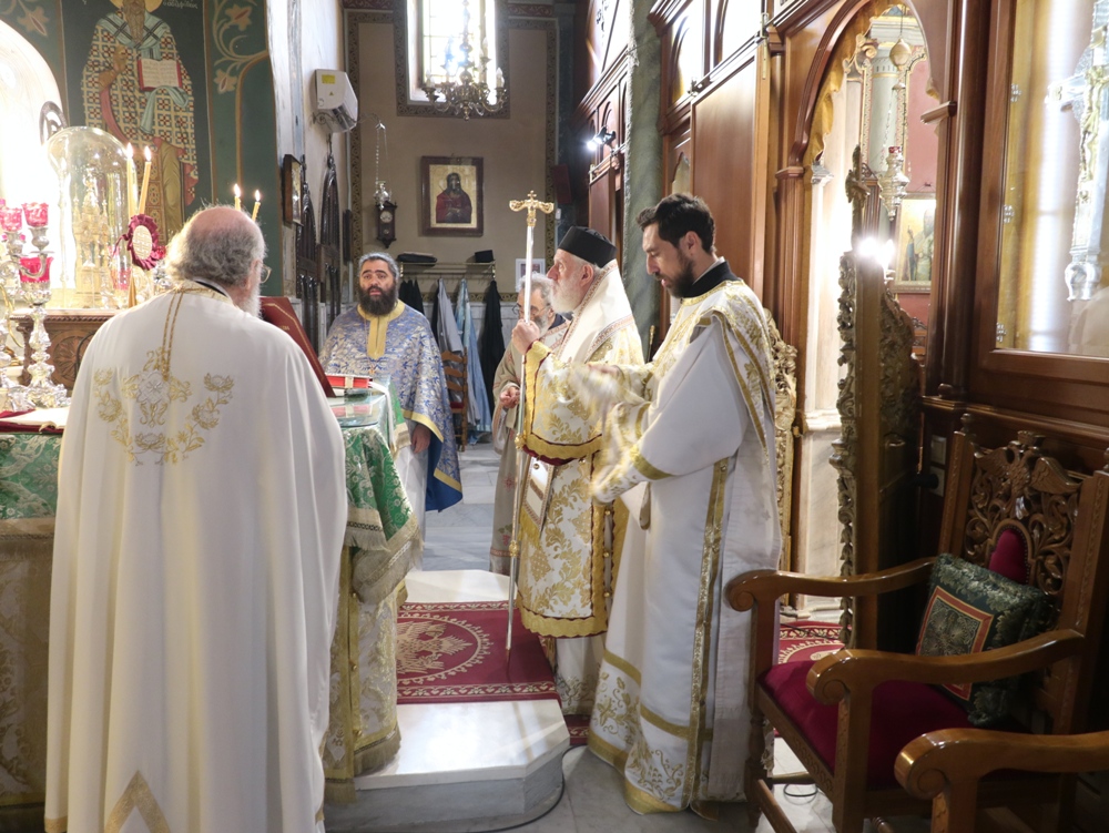 Στον Ιερό Μητροπολιτικό Ναό της Μεταμορφώσεως του Σωτήρος, στην Ερμούπολη, όπου φυλάσσεται θαυματουργός Εικόνα της Παναγίας της Φανερωμένης, τελέσθηκε σήμερα το πρωί Αρχιερατική Θεία Λειτουργία, ιερουργούντος του Σεβασμιωτάτου κ. Δωροθέου Β', συμπαραστατουμένου από τους Εφημερίους του Ναού, Πρωτοπρεσβυέρους Εμμανουήλ Συρίγο και Αντώνιο Βελούδιο, τον Πρωτοπρ. Αντώνιο Τριανταφύλλου, τον εκ Θεσσαλονίκης Αρχιμ. Μακάριο Τσιμέρη, και τους διακόνους, με την παρουσία πολλών πιστών, παρά το εργάσιμο της ημέρας.